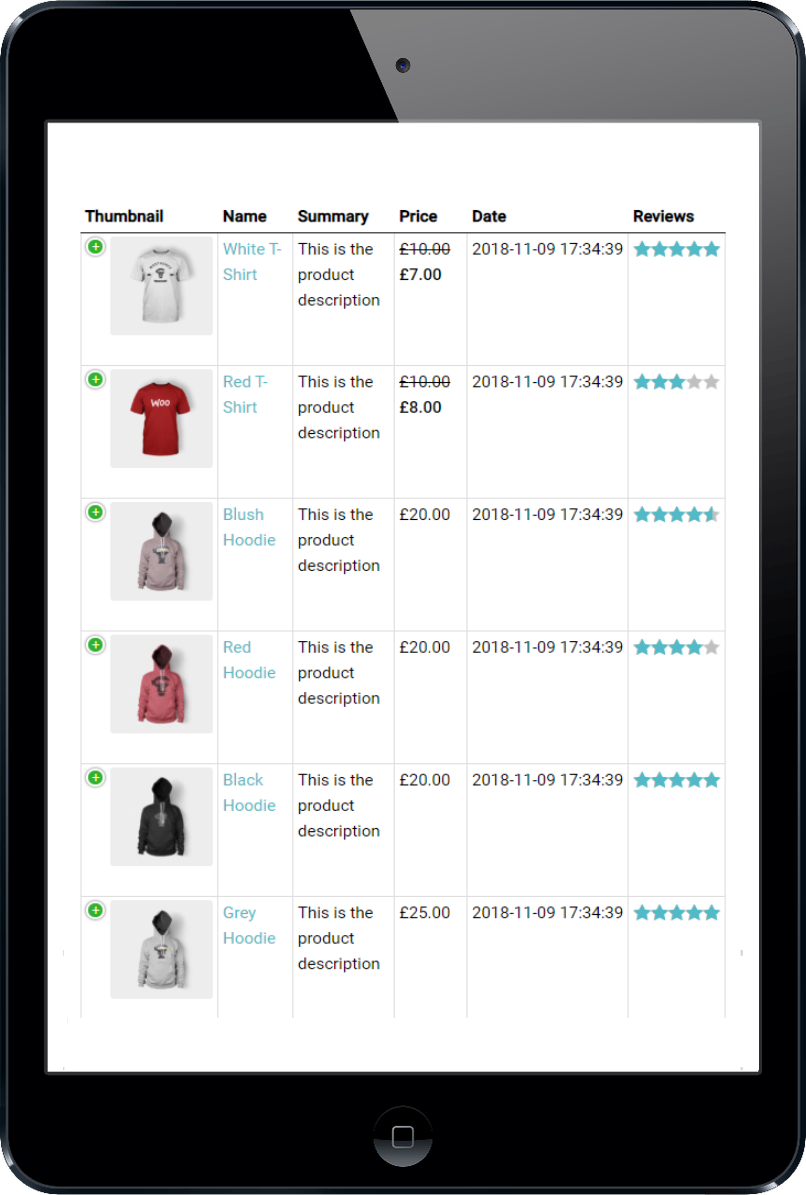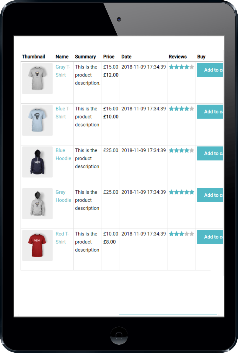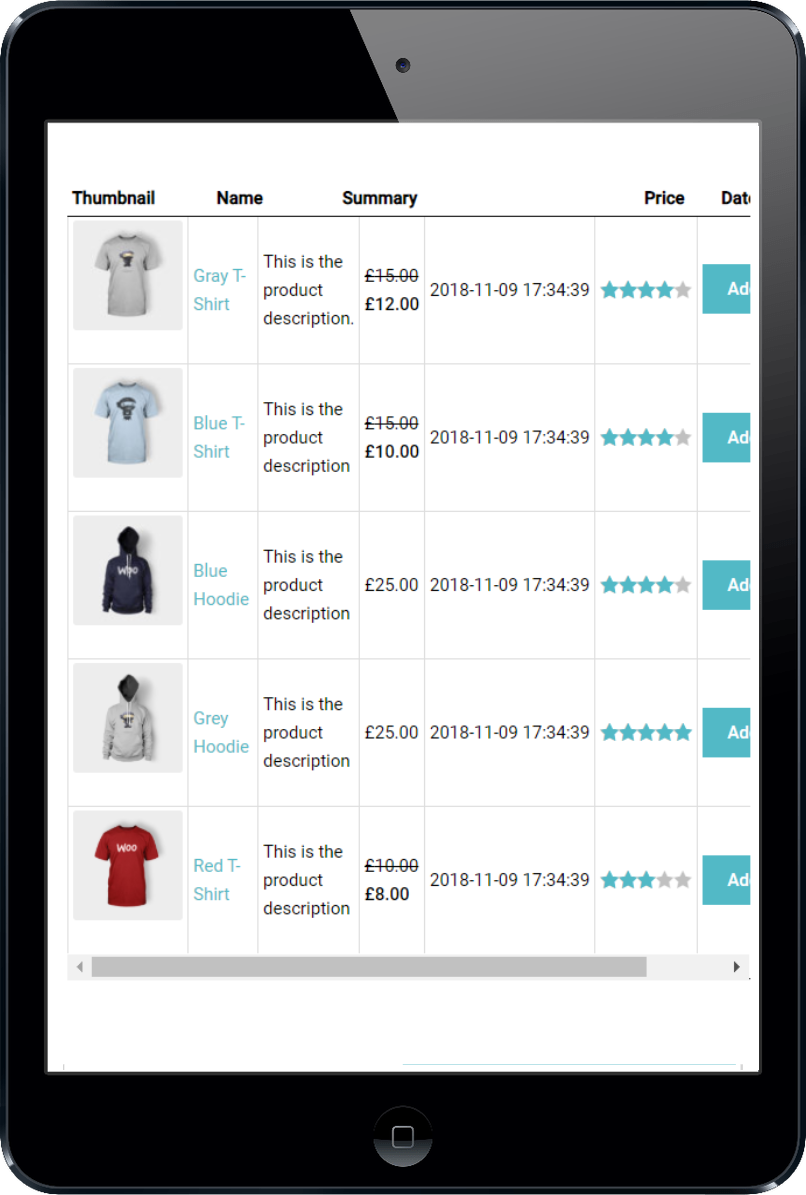 WooCommerce Product Table comes with 4 responsive modes to control the tables behave on different screen dimensions (PC, mobile phones and tablets):